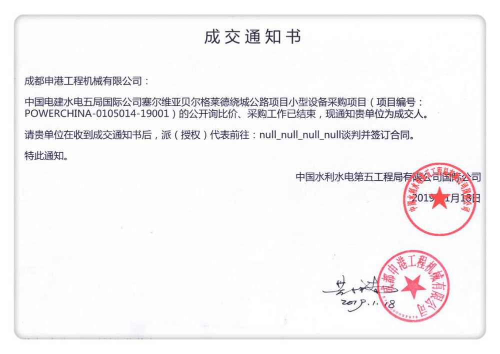 2019年1月18日,我公司收到中國電建水電五局國際公司發(fā)來的關于塞爾維亞貝爾格萊德繞城公路項目小型設備采購項目的“成交通知書”,我公司為成交人,目前該設備已用木箱包裝完畢,準備發(fā)往指定港口。