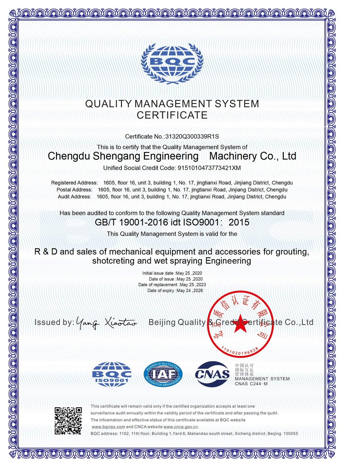5月25日,成都申港工程機械有限公司完成《質量管理體系認證證書》換證工作,標志著成都申港公司質量管理體系工作再次得到中國質量認證中心關于ISO9001質量管理體系的認證和審核。